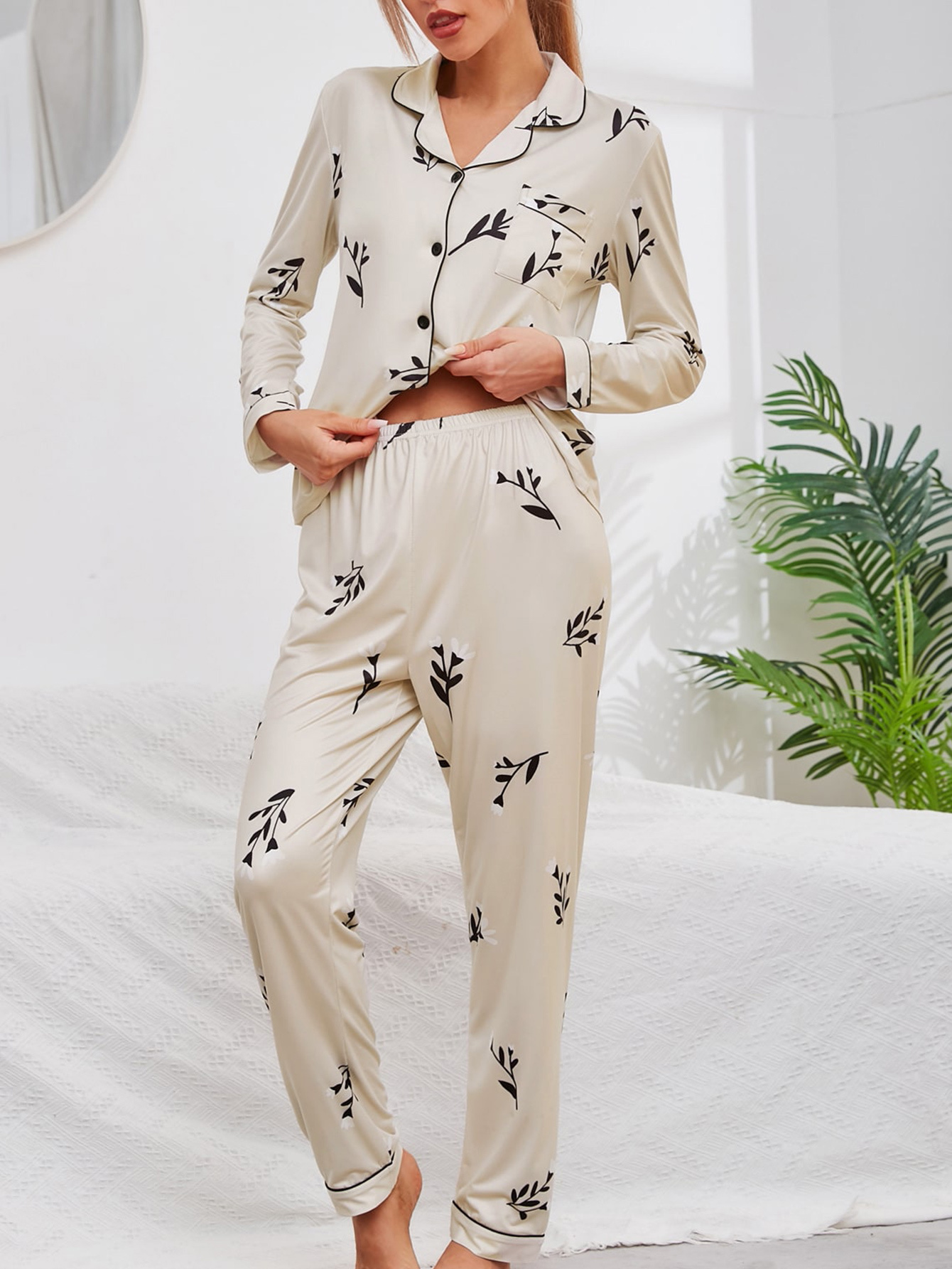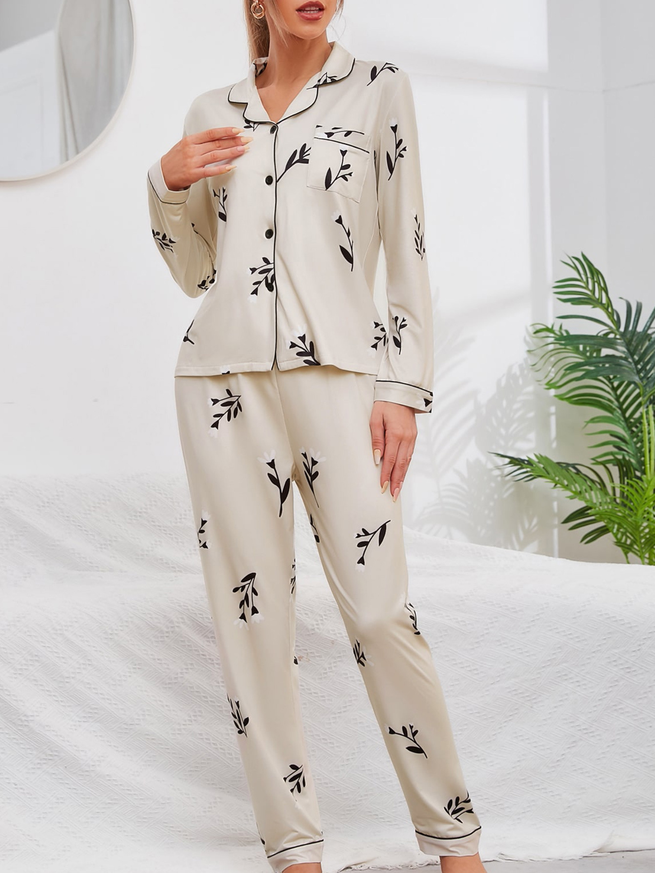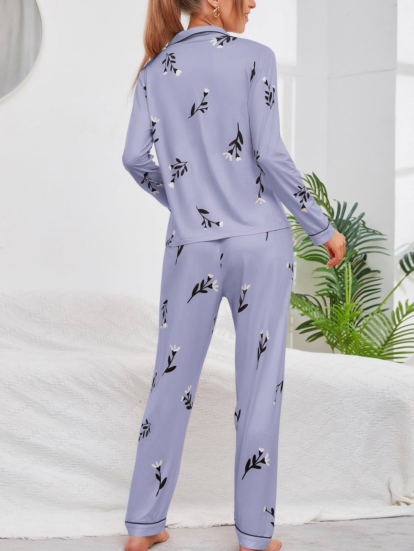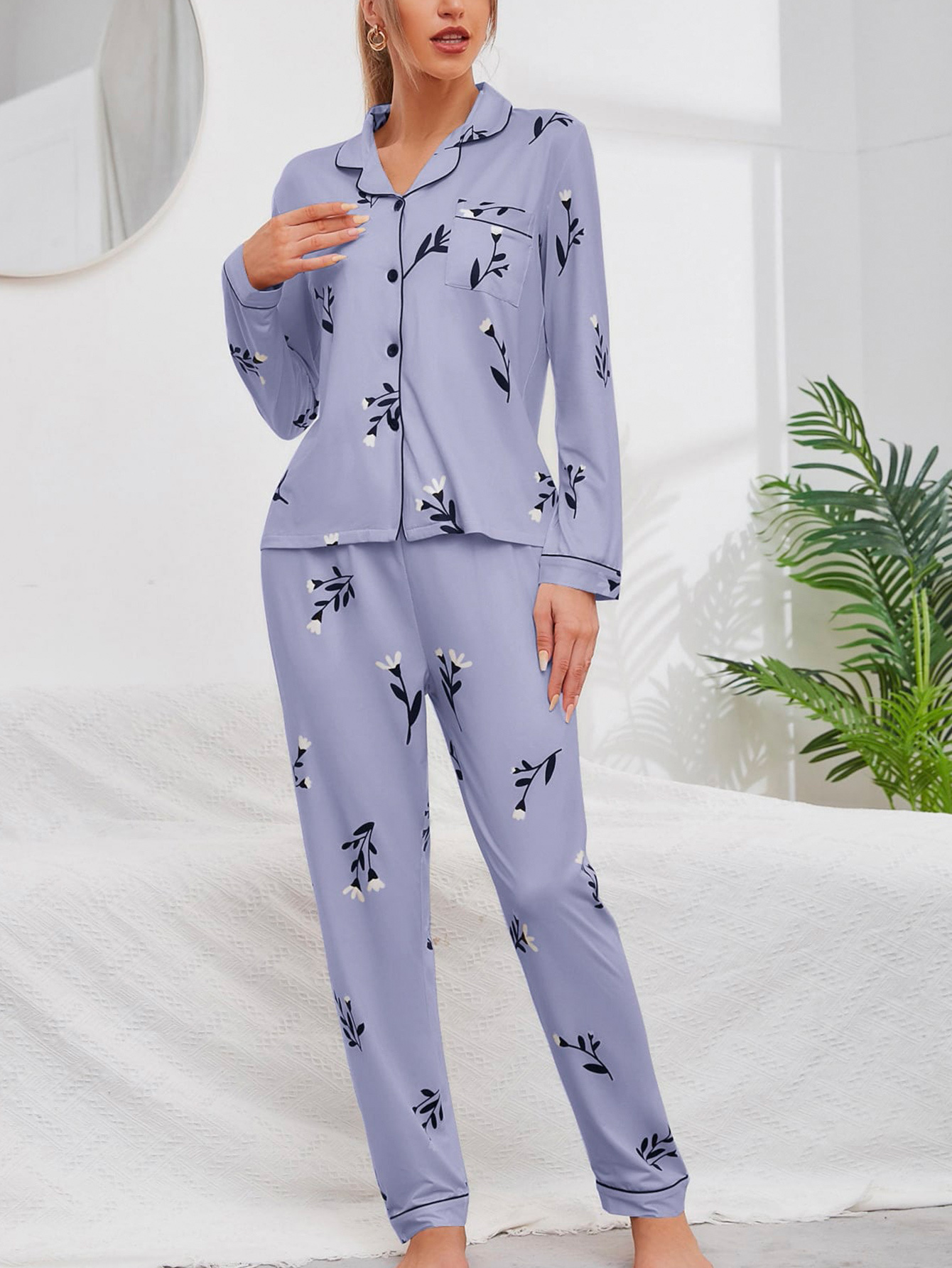 Elegant Floral Print Pajamas Sets, Long Sleeve Blouse Pajama Top & Elastic Waist